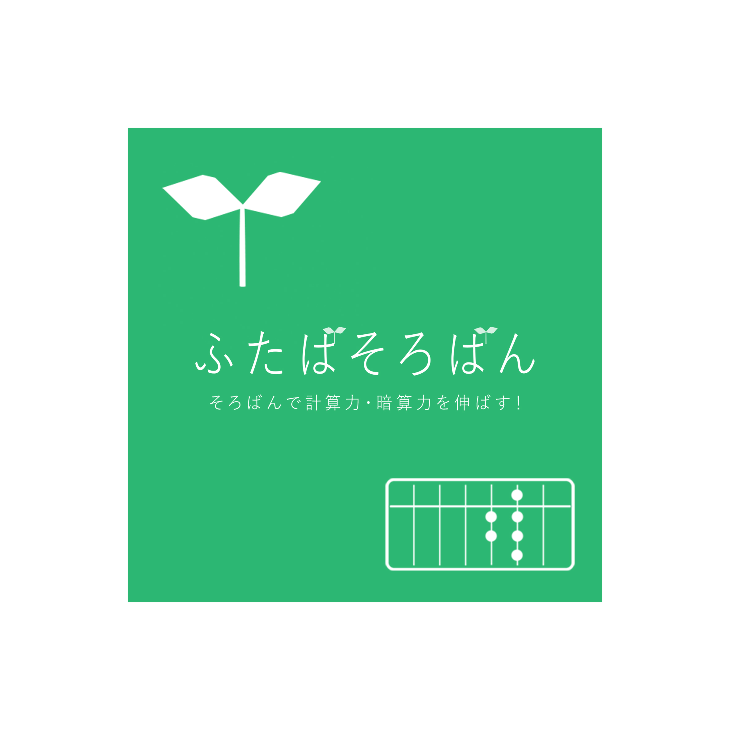 教室名の「ふたば」をそろばんのたまで表現。ふたばの若々しく生き生きとしたグリーンを使用。ふたばの❝28❞をそろばんで表現。